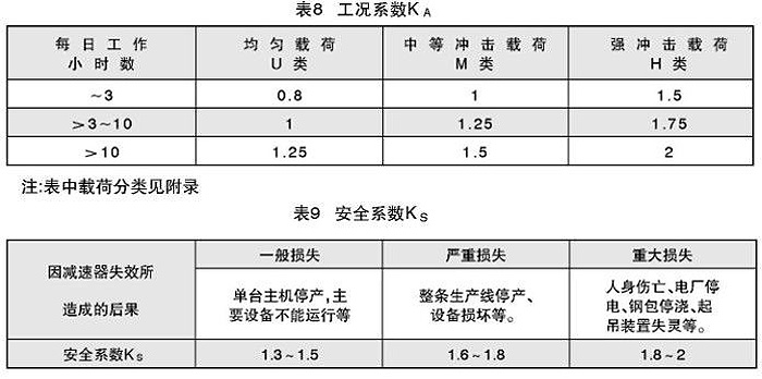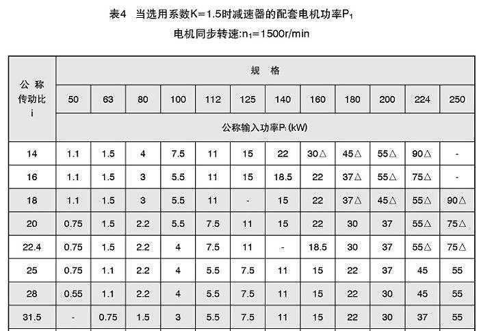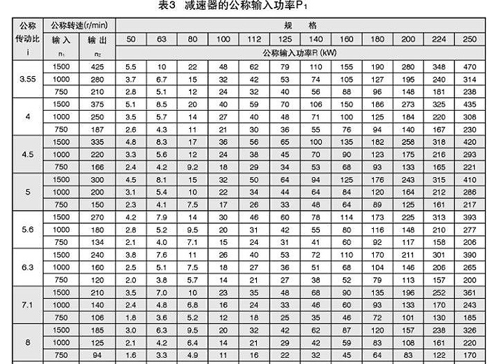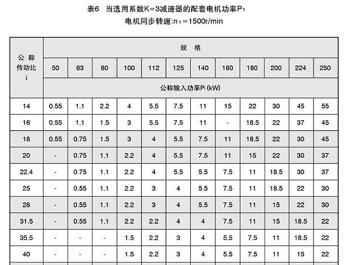 对一般重要程度,选用批量不大,连续运输的减速器:均匀载荷K=1.5:中等冲击载荷K=2;强冲击载荷K=3。确定选用系数K,根据输入电机功率和要求的传动比i,从表4、5、6中选定减速器。