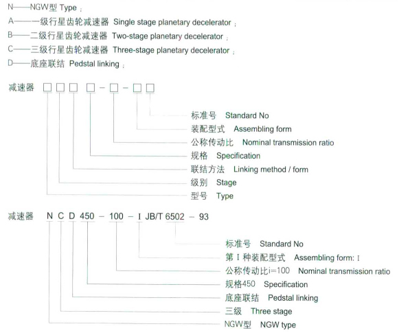其标记符号:Symbol include:type,stage no,linking,form,nominal transmission ratio,assembling form,standard no。