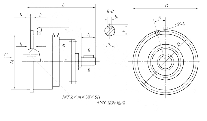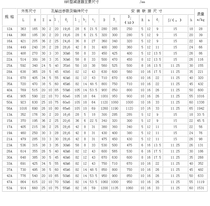 工作条件:输入转速28B型以下≤3000 r/min,40B型以下≤1800r/min,45B型以下≤1000r/min,Y型≤1500r/min;公称转矩2.107~588kN·m;传递功率0.25~2000kW;工作环境温度为-40~45℃,低于0℃时,启动前润滑油应预热,高于45℃时应采取降温措施。尺寸