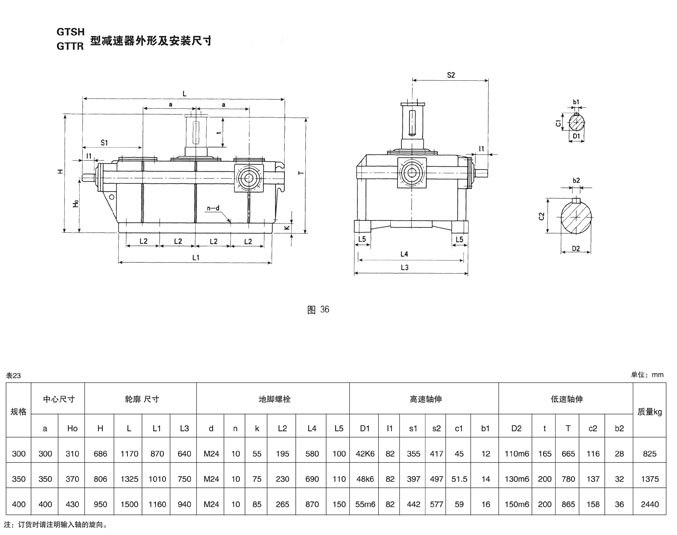 产品用途: GTTR三环减速机为组合二级传动,为钢包回转台用,具有两根垂直于平面的高速轴,箱体平置,装端面剖分,此减速机中心距范围300-400mm,速比77.9-503.3,输出转矩范围10.52-24.67kN.m。